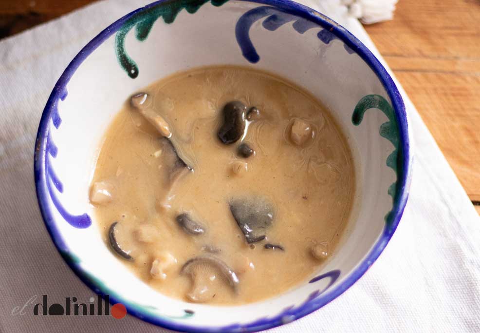 Debe quedar una crema suave. Se deja cocer un par de minutos, hasta que la harina haya perdido el sabor a “crudo” y se agregan las setas, cociendo otro par de minutos. Si espesaran demasiado, se le añade un poco más de agua. Finalmente se añade sal al gusto.